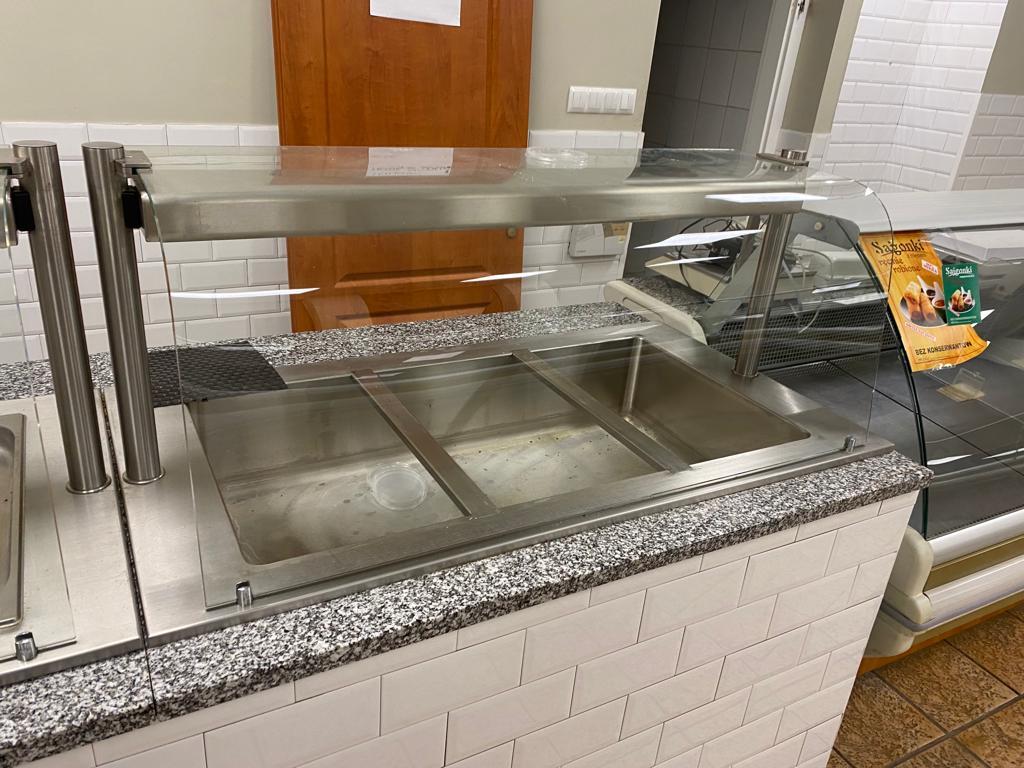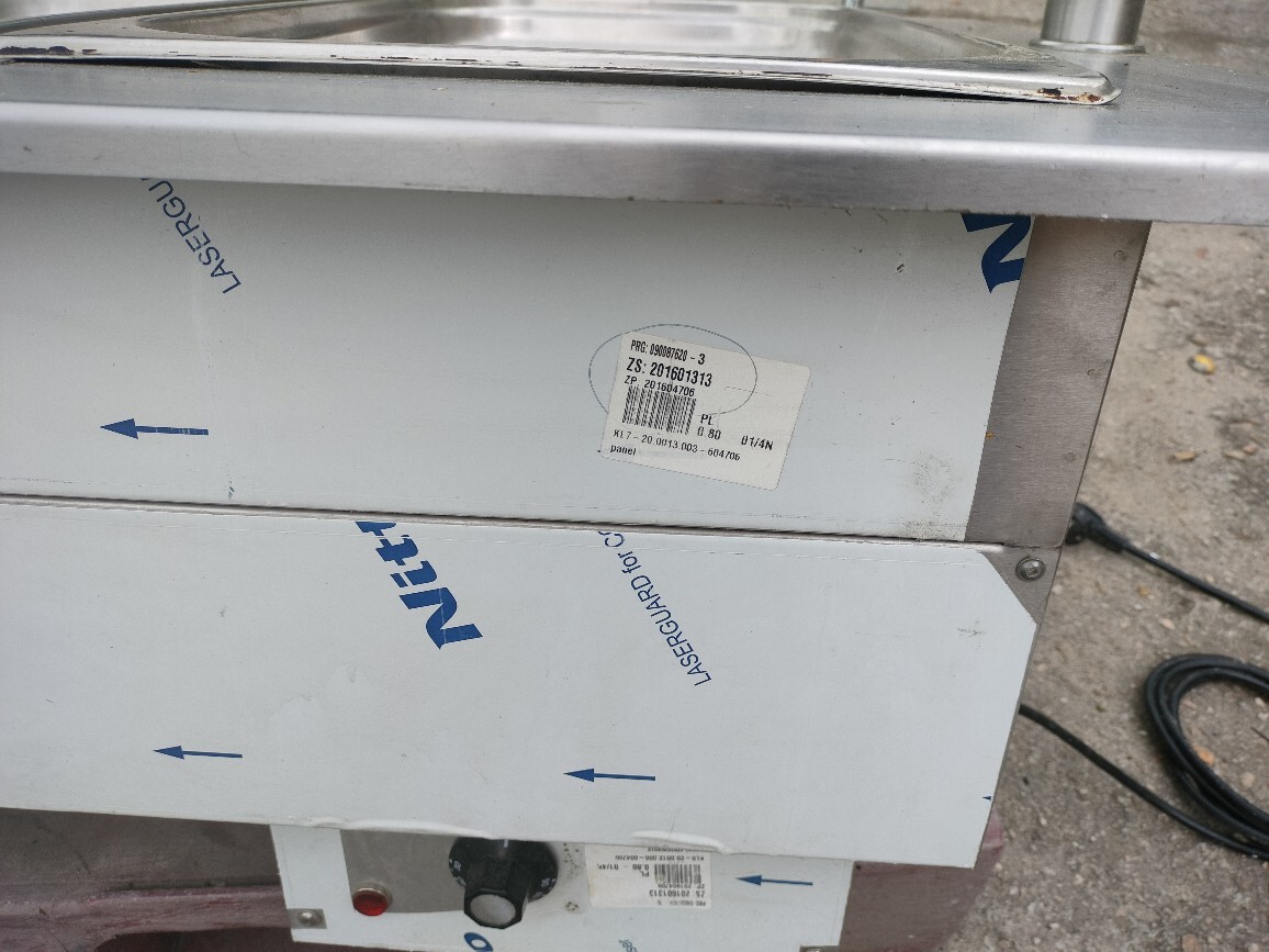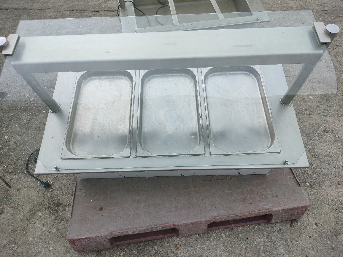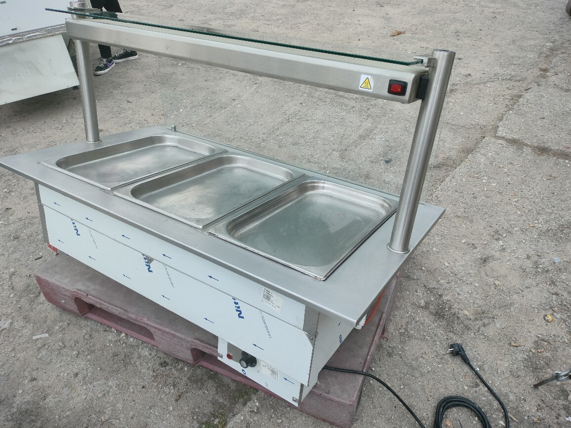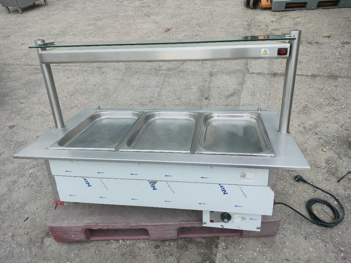 Bemar wodny z nadstawką grzewczą KOMAT 3 × GN 1/1, moc 3 kW. Idealny do utrzymywania temperatury gorących potraw w gastronomii. Regulacja 30–95°C, podgrzewana nadstawka z oświetleniem.