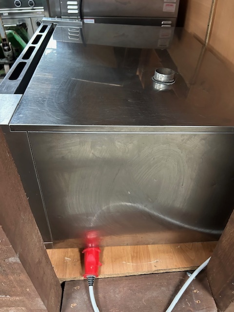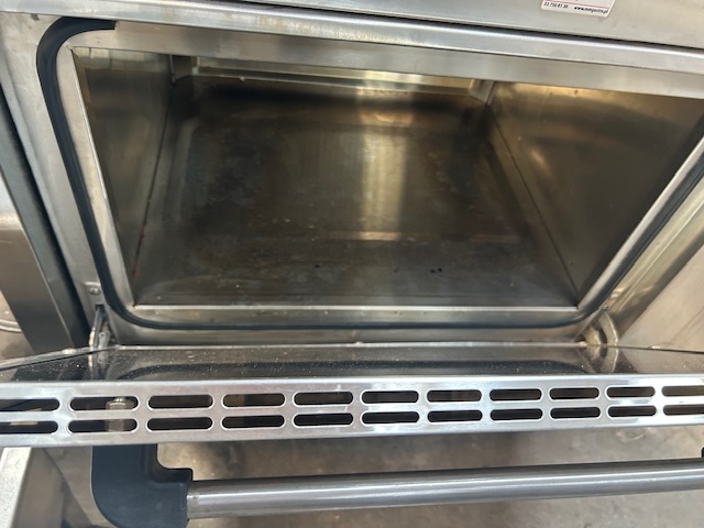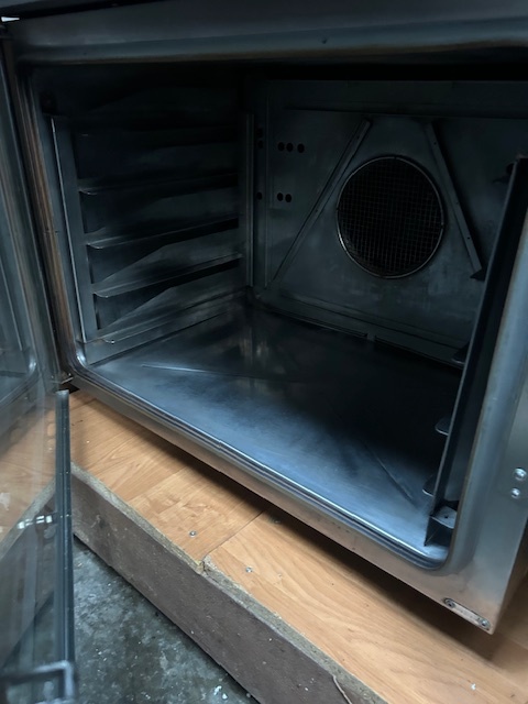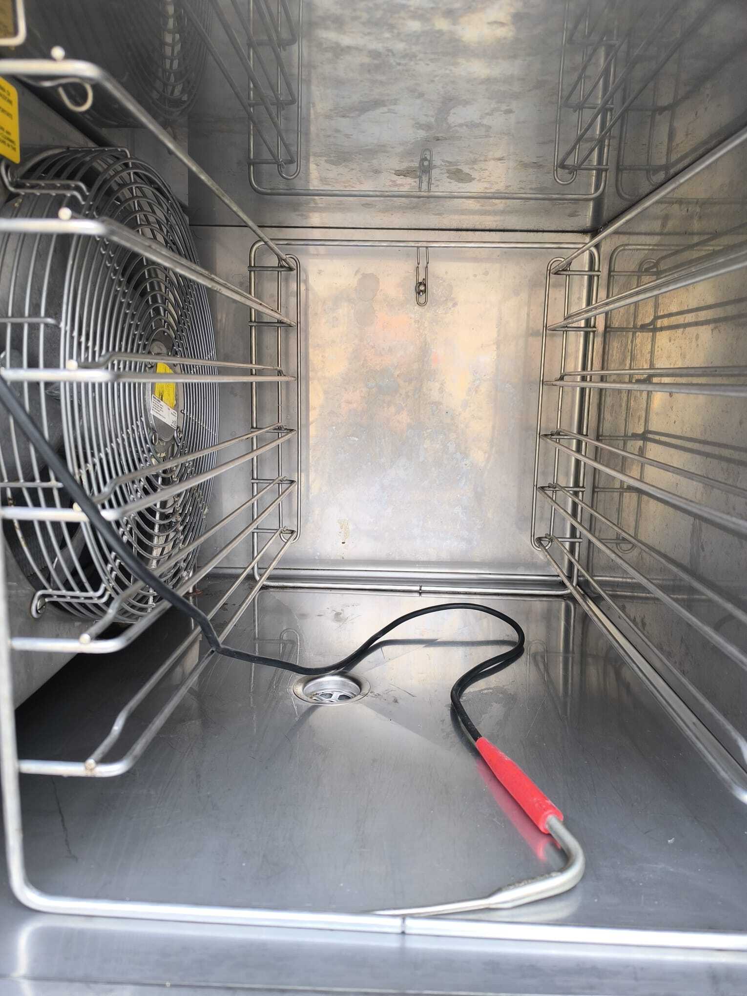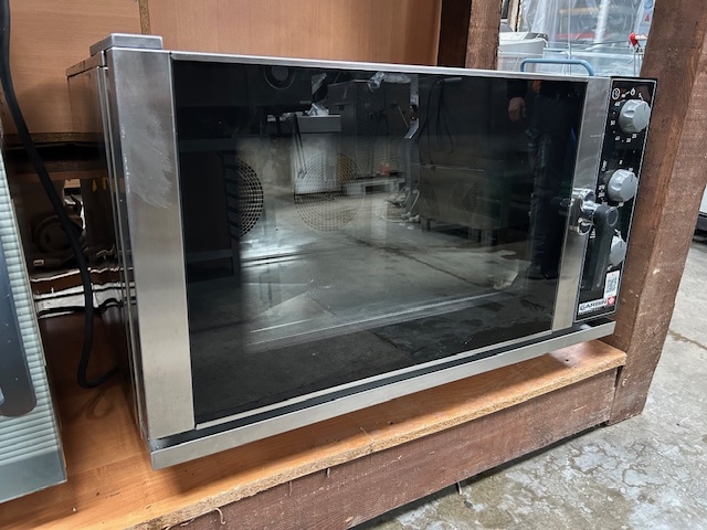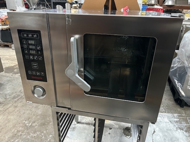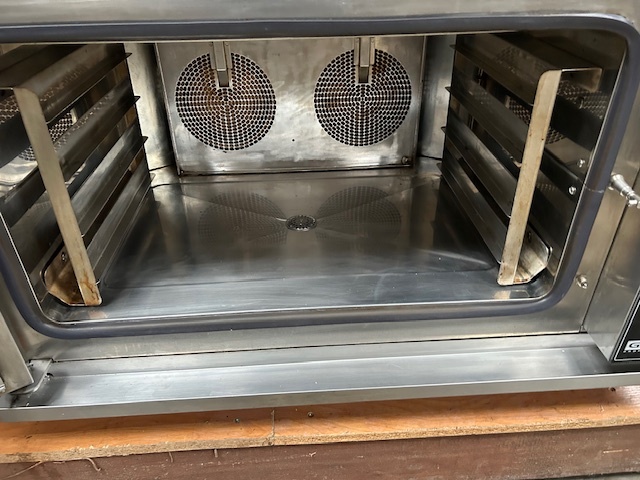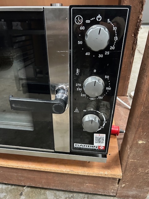 Piec konwekcyjno-parowy GARBIN 46P na 4 blachy 600 × 400 mm. Manualne sterowanie, dwa wentylatory z rewersem oraz zakres temperatur do 270 °C. Urządzenie sprawne, gotowe do pracy.